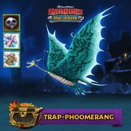 Trap-phoomerang appears very similar to a normal Typhoomerang. It is teal in color with some black spirals on its wings. It has a tan underbelly and two teal horns on the back of its head and one teal horn on its snout. It also has a teal wing claw on each of its wings.