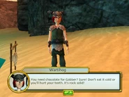 Wartihog also appears in the Quest, "Chocolate in a Bottle". Gobber's chocolate has hardened in a bottle and he can't get it out. Heather asks the player to collect chocolate from NPC characters, including Wartihog, to experiment with.