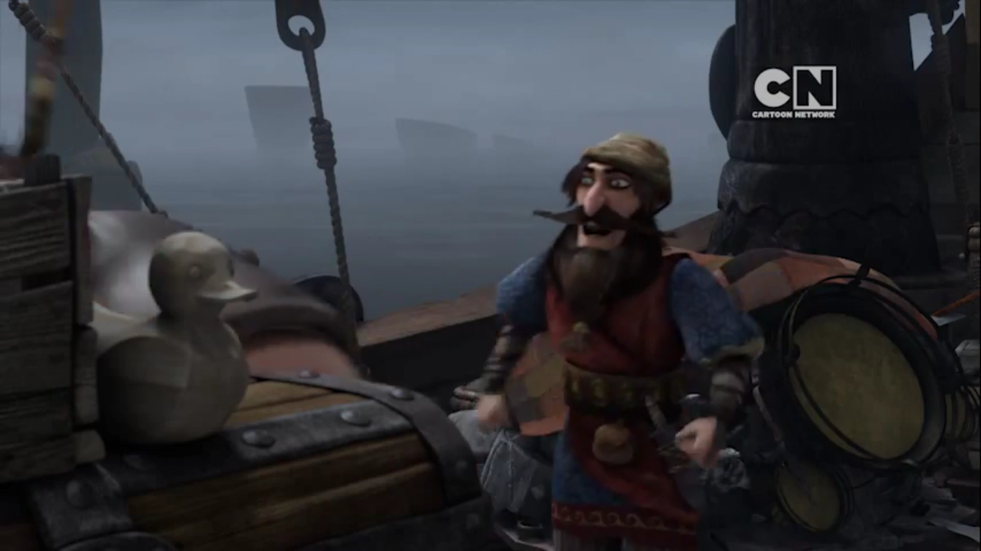 Gobber the Belch is seen whittling a wooden duck while sitting in the Haddock House speaking with Stoick, in "How to Start a Dragon Academy".