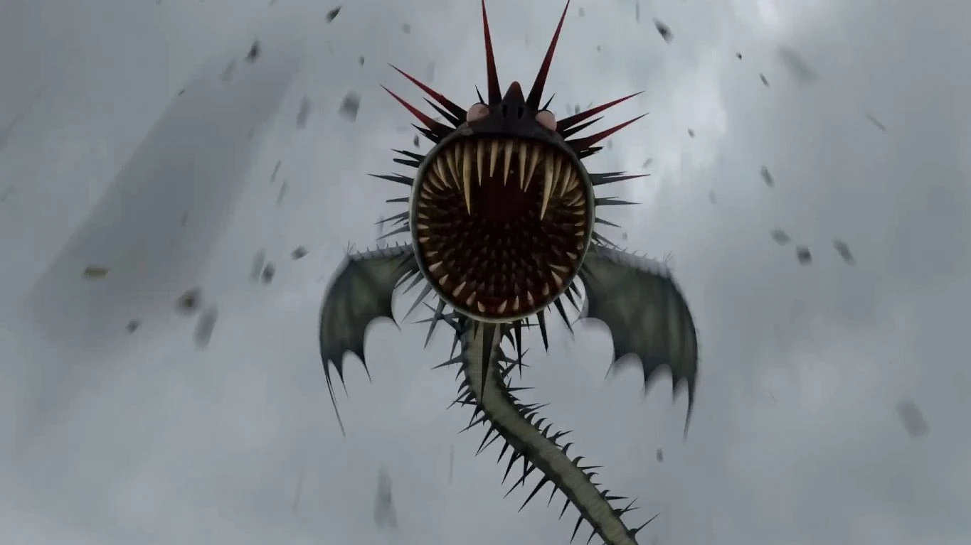 The Whispering Death sticks out its head to devour Hiccup as he plummets down towards its mouth. Luckily, Stormfly manages to rescue him in time. The Whispering Death is now in its aggressive state after Hiccup and Fishlegs trespass inside its home and when Hiccup attempts to thwart it with dragon nip, the Whispering Death sneezes and throws it to the other dragons, leaving them passed out and the Riders defenseless. Hiccup is open for ideas, Snotlout recommends that they run for their lives.