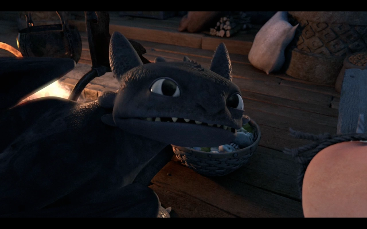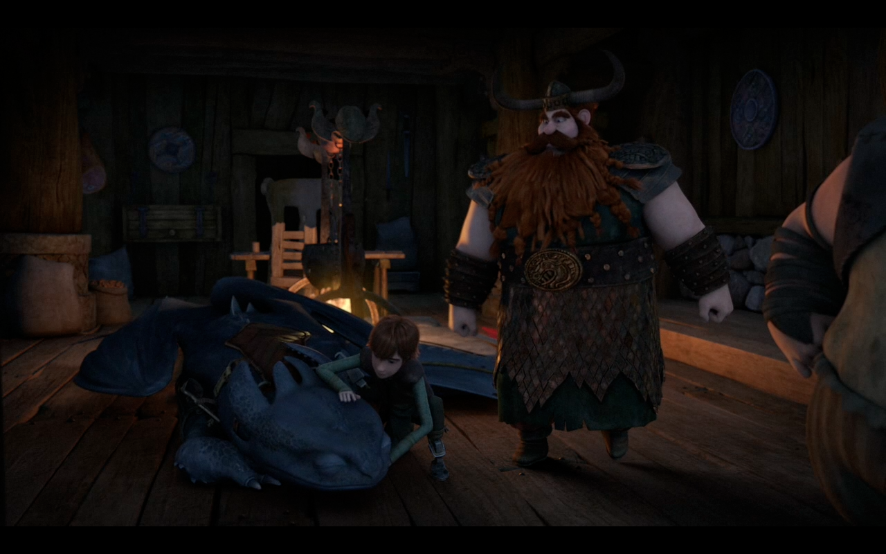 The scene changes to Hiccup's home, where he, Gobber, and Stoick celebrate the success of the perch project while Toothless has dinner. Stoick states it's some of Hiccup's best work yet . . . although as Stoick almost takes a drink from his mug, he notices something disgusting in the water and as he shows Gobber, who checks his own mug, adds they may need to move the perch that's over the well. Hiccup, excited by the perches' recent success, becomes fixated on the topic of building other things for dragons, such as landing pads, or stables in the caves below the village. As he does so, he reaches for his cup and lifts it, but his father quietly pushes it back onto the table, preventing the distracted teen from drinking it. Stoick stops him with a chuckle, reminding him to remember the village is still for Vikings, Gobber adding it's Viking (priorities) over dragons, reaffirming with Toothless when he looks up at him. After he says this, the rumbling of thunder comes from outside the house, and Toothless sits up, before running upstairs.