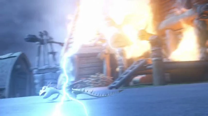 The lightning bolts grow in strength, striking the perches and arcing to the nearby wooden buildings, setting homes on fire. A Terrible Terror panics in the middle of all the flames, but Astrid swoops in on Stormfly and rescues it. Stoick orders Gobber to organize a bucket brigade while he heads to the Great Hall. Having come down to Hiccup's side and joined him outside, a nearby strike spooks Toothless and he runs off.