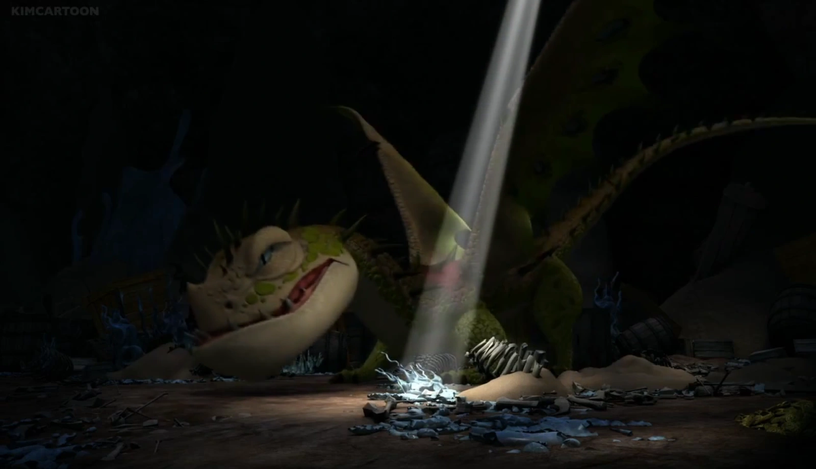 While chasing Amos at the Northern Markets , Hiccup and Snotlout find themselves on what appears to be an empty beach. Snotlout is then suddenly grabbed by a dragon tail and pulled underground along with Hiccup. During their fall, a Sandbuster, the dragon that caught the boys, roars at them. Below the surface, in a cave, Hiccup and Snotlout discover the Sandbuster's lair, full of treasures and bones. They also find Amos, who has been caught by the wild dragon too. While the Sandbuster was walking through its nest, Amos attacks it. The dragon immediately starts firing at the humans, considering them a threat. When Snotlout trips he accidentally triggers one of the crossbows, that he and Hiccup found earlier, and it shoots an arrow and makes a hole in the roof, the Sandbuster runs away, affected by the direct sunlight. Hiccup then makes a cage for the next time the Sandbuster arrives. Right when the three are about to escape, the Sandbuster attacks. Hiccup then begins making holes in the roof, trapping the Sandbuster between rays of sunlight. However, the dragon is able to escape and re-patches the numerous holes with his blasts. He then quickly brings down the stacked treasure and Hiccup's betrothal gift rolls behind the Sandbuster. Hiccup quickly slips under the dragon to grab the medallion and use it to redirect the remaining sunlight against the Sandbuster. This draws it away from Snotlout and Amos, whom Hiccup tells them to run but Snotlout pulls Amos back as they cannot let Hiccup alone to die, but Amos points out they'll all die if they remain. Suddenly, a glass ceiling shatters as the Riders break through. The Sandbuster is overwhelmed and retreats allowing Hiccup, Snotlout and Amos to be rescued.