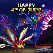 Wonderclap appeared in the skies above Berk during the Bork Week. The villagers thought this dragon was part of the show, perhaps due to it's bright coloring. However, Wonderclap started shooting fire above the crowd. It is not clear if the dragon was joining the festivities or was perhaps spooked by the commotion of the crowd and fireworks.